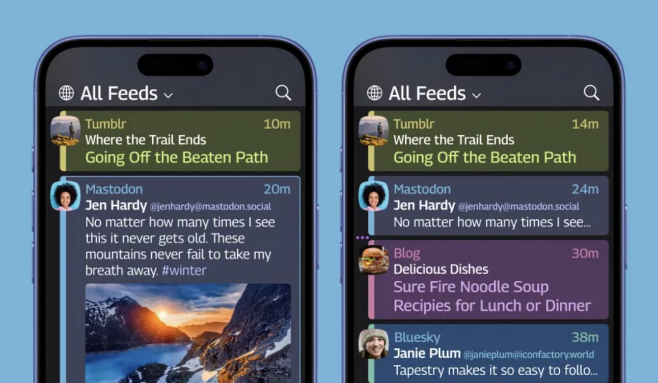 What’s happening: Apps like Tapestry, Reeder, Unread, Feeeed, and Surf are taking an old-school RSS reader approach, but modernized for today’s internet. Instead of bouncing between YouTube, Bluesky, Instagram, podcasts, newsletters, and news sites, timeline apps bring all your favorite feeds into one place—chronologically ordered, no algorithm meddling.